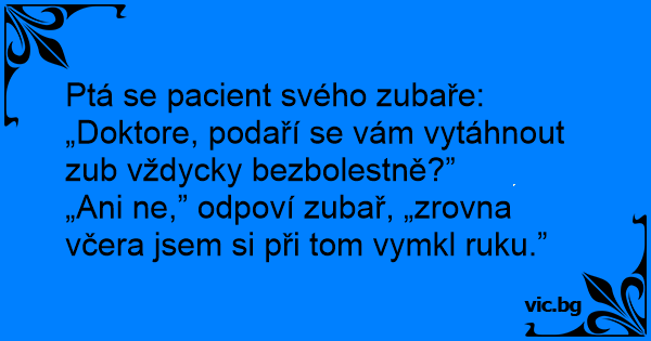 „Ani ne,” odpoví zubař, „zrovna včera jsem si při tom vymkl ruku.”