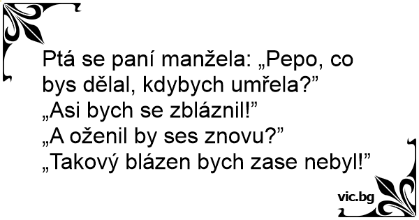 Ptá se paní manžela: „Pepo, co bys dělal, kdybych umřela?” „Asi bych se zbláznil!” „A oženil by ses znovu?” „Takový blázen bych zase nebyl!”