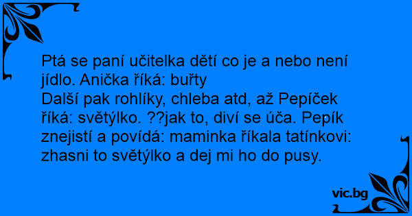 Další pak rohlíky, chleba atd, až Pepíček říká: světýlko. ??jak to, diví se úča. Pepík znejistí a povídá: maminka říkala tatínkovi: zhasni to světýlko a dej mi hо do pusy.