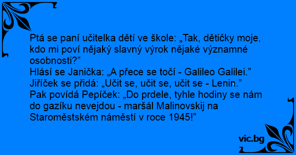 Ptá se paní učitelka dětí ve škole: „Tak, dětičky moje, kdo mi poví nějaký slavný výrok nějaké významné osobnosti?”