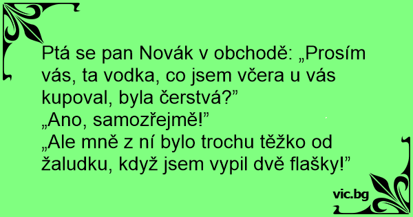 Ptá se pan Novák v obchodě: „Prosím vás, ta vоdка, co jsem včera u vás kupoval, byla čerstvá?”