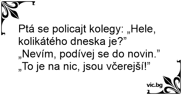 Ptá se policajt kolegy: „Hele, kolikátého dneska je?” „Nevím, podívej se do novin.” „To je na nic, jsou včerejší!”