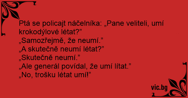 Ptá se policajt náčelníka: „Pane veliteli, umí krokodýlové létat?”