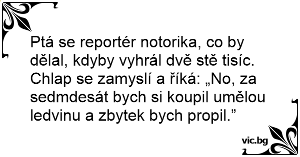 Ptá se reportér notorika, co by dělal, kdyby vyhrál dvě stě tisíc. Chlap se zamyslí a říká: „No, za sedmdesát bych si koupil umělou ledvinu a zbytek bych propil.”