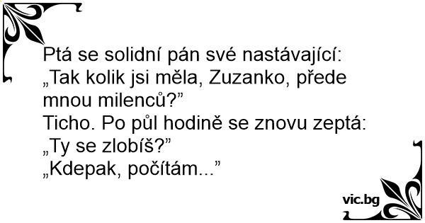 Ptá se solidní pán své nastávající: „Tak kolik jsi měla, Zuzanko, přede mnou milenců?”