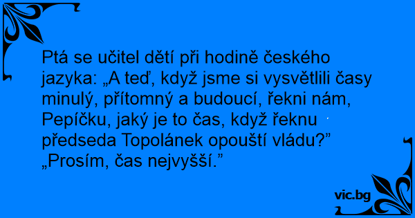 Ptá se učitel dětí při hodině českého jazyka: „A teď, když jsme si vysvětlili časy minulý, přítomný a budoucí, řekni nám, Pepíčku, jaký je to čas, když řeknu předseda Topolánek opouští vládu?”