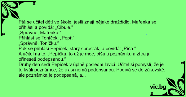Ptá se učitel dětí ve škole, jestli znají nějaké dráždidlo. Mařenka se přihlásí a povídá: „Cibule.”