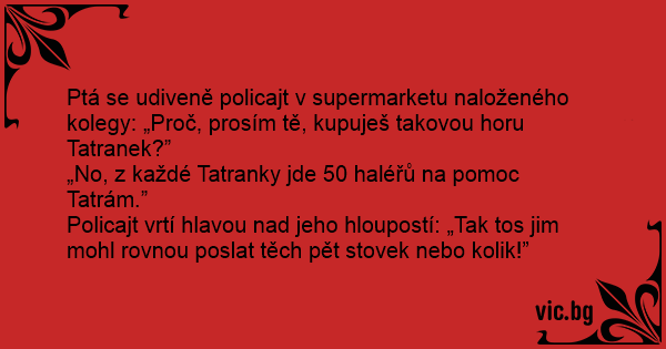 Ptá se udiveně policajt v supermarketu naloženého kolegy: „Proč, prosím tě, kupuješ takovou horu Tatranek?”