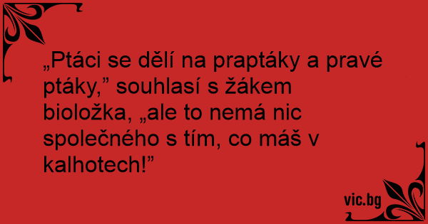 „Ptáci se dělí na praptáky a pravé ptáky,” souhlasí s žákem bioložka, „ale to nemá nic společného s tím, co máš v kalhotech!”