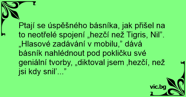 Ptají se úspěšného básníka, jak přišel na to neotřelé spojení „hezčí než Tigris, Nil”.