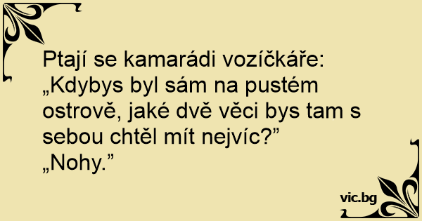 Ptají se kamarádi vozíčkáře: „Kdybys byl sám na pustém ostrově, jaké dvě věci bys tam s sebou chtěl mít nejvíc?”