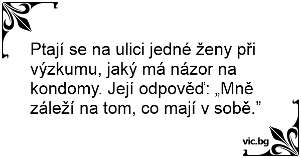 Ptají se na ulici jedné ženy při výzkumu, jaký má názor na kondomy. Její odpověď: „Mně záleží na tom, co mají v sobě.”