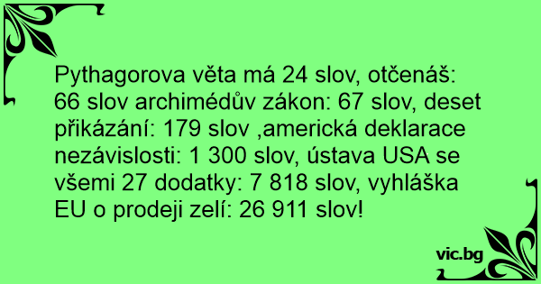 Pythagorova věta má 24 slov, otčenáš: 66 slov archimédův zákon: 67 slov, deset přikázání: 179 slov ,americká deklarace nezávislosti: 1 300 slov, ústava USA se všemi 27 dodatky: 7 818 slov, vyhláška EU o prodeji zelí: 26 911 slov!