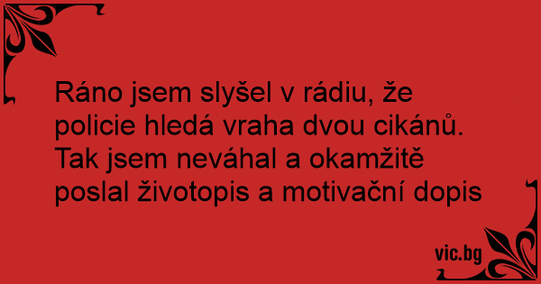 Ráno jsem slyšel v rádiu, že policie hledá vraha dvou cikánů. Tak jsem neváhal a okamžitě poslal životopis a motivační dopis