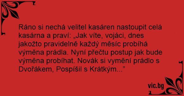 Ráno si nechá velitel kasáren nastoupit celá kasárna a praví: „Jak víte, vojáci, dnes jakožto pravidelně každý měsíc probíhá výměna prádla. Nyní přečtu postup jak bude výměna probíhat. Novák si vymění prádlo s Dvořákem, Pospíšil s Krátkým...”