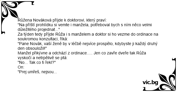 "Pane Novák, vaší ženě by v léčbě nejvíce prospělo, kdybyste ji každý druhý den obsouložil!"