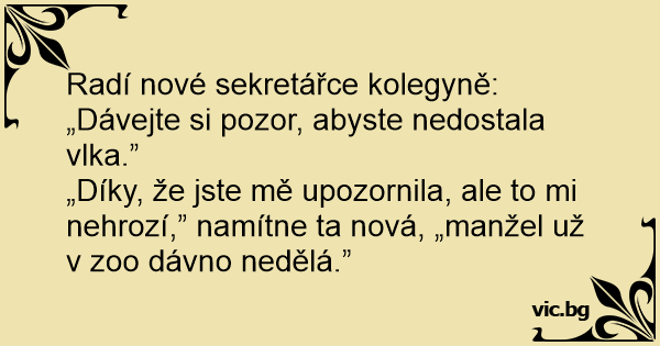 „Díky, že jste mě upozornila, ale to mi nehrozí,” namítne ta nová, „manžel už v zoo dávno nedělá.”
