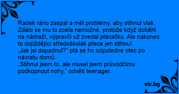 Radek ráno zaspal a měl problémy, aby stihnul vlak. Zdálo se mu to zcela nemožné, protože když doběhl na nádraží, výpravčí už zvedal plácačku. Ale nakonec to dojíždějící středoškolák přece jen stihnul.