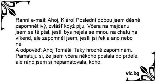 Ranní e-mail: Ahoj, Kláro! Poslední dobou jsem děsně zapomnětlivý, zvlášť když piju. Včera na mejdanu jsem se tě ptal, jestli bys nejela se mnou na chatu na víkend, ale zapomněl jsem, jestli jsi řekla ano nebo ne.