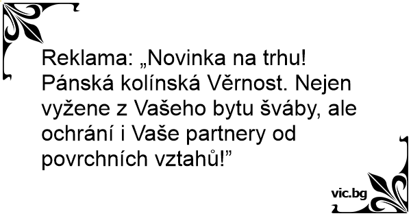 Reklama: „Novinka na trhu! Pánská kolínská Věrnost. Nejen vyžene z Vašeho bytu šváby, ale ochrání i Vaše partnery od povrchních vztahů!”