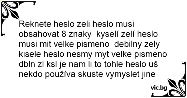 Reknete heslo zeli heslo musi obsahovat 8 znaky kyselí zelí heslo musi mit velke pismeno debilny zely kisele heslo nesmy myt velke pismeno dbln zl ksl je nam li to tohle heslo uš nekdo používa skuste vymyslet jine