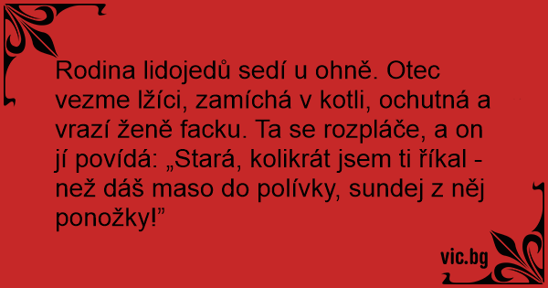 Rodina lidojedů sedí u ohně. Otec vezme lžíci, zamíchá v kotli, ochutná a vrazí ženě facku. Ta se rozpláče, a on jí povídá: „Stará, kolikrát jsem ti říkal - než dáš maso do polívky, sundej z něj ponožky!”