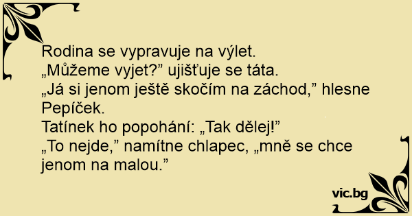 „Já si jenom ještě skočím na záchod,” hlesne Pepíček.
