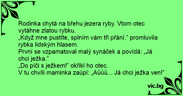 „Když mne pustíte, splním vám tři přání,” promluvila rybka lidským hlasem.