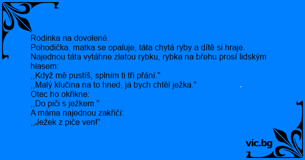 Pohodička, matka se opaluje, táta chytá ryby a dítě si hraje. Najednou táta vytáhne zlatou rybku, rybka na břehu prosí lidským hlasem: