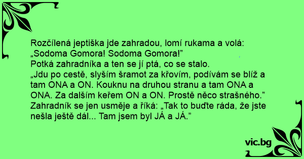 Rozčílená jeptiška jde zahradou, lomí rukama a volá: „Sodoma Gomora! Sodoma Gomora!”