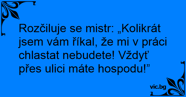 Rozčiluje se mistr: „Kolikrát jsem vám říkal, že mi v práci chlastat nebudete! Vždyť přes ulici máte hospodu!”