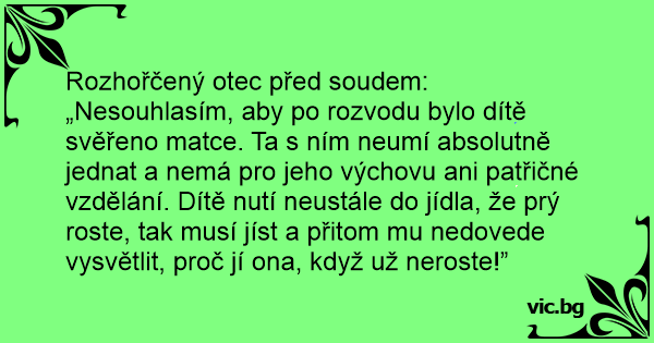 Rozhořčený otec před soudem: „Nesouhlasím, aby po rozvodu bylo dítě svěřeno matce. Ta s ním neumí absolutně jednat a nemá pro jeho výchovu ani patřičné vzdělání. Dítě nutí neustále do jídla, že prý roste, tak musí jíst a přitom mu nedovede vysvětlit, proč jí ona, když už neroste!”
