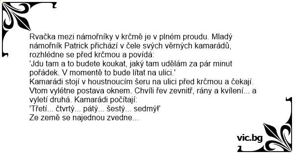 Kamarádi stojí v houstnoucím šeru na ulici před krčmou a čekají. Vtom vylétne postava oknem. Chvíli řev zevnitř, rány a kvílení... a vyletí druhá. Kamarádi počítají: