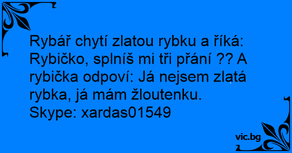 Rybář chytí zlatou rybku a říká: Rybičko, splníš mi tři přání ?? A rybička odpoví: Já nejsem zlatá rybka, já mám žloutenku.