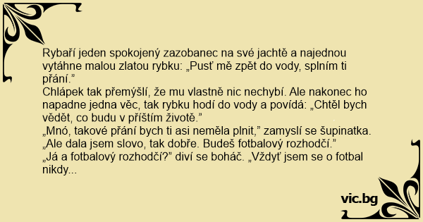 „Já a fotbalový rozhodčí?” diví se boháč. „Vždyť jsem se o fotbal nikdy nezajímal a ani pořádně neznám pravidla. Třeba vůbec nevím, co je takový ofsajd.”