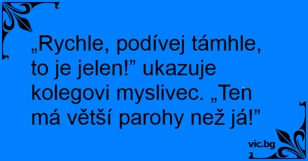 „Rychle, podívej támhle, to je jelen!” ukazuje kolegovi myslivec. „Ten má větší parohy než já!”