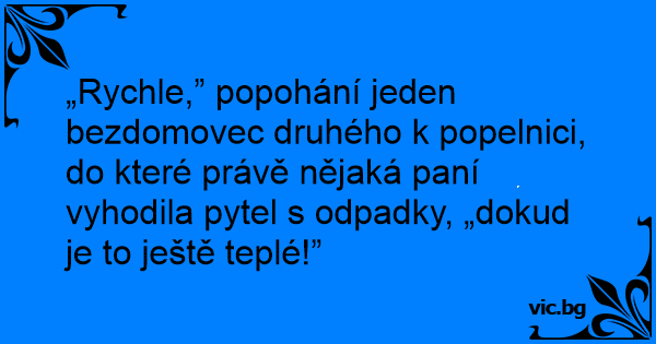 „Rychle,” popohání jeden bezdomovec druhého k popelnici, do které právě nějaká paní vyhodila pytel s odpadky, „dokud je to ještě teplé!”