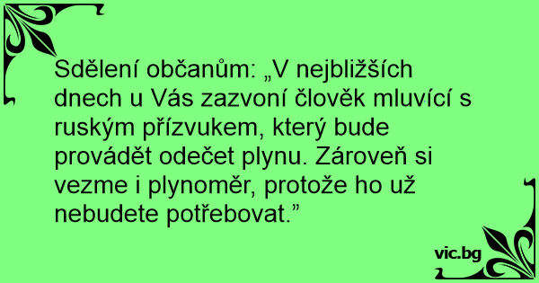 Sdělení občanům: „V nejbližších dnech u Vás zazvoní člověk mluvící s ruským přízvukem, který bude provádět odečet plynu. Zároveň si vezme i plynoměr, protože hо už nebudete potřebovat.”