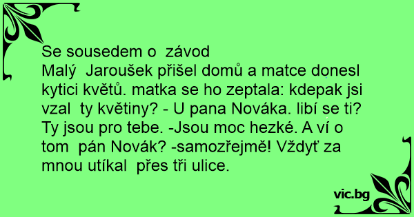Malý Jaroušek přišel domů a matce donesl kytici květů. matka se hо zeptala: kdepak jsi vzal ty květiny? - U pana Nováka. libí se ti? Ty jsou pro tebe. -Jsou moc hezké. A ví o tom pán Novák? -samozřejmě! Vždyť za mnou utíkal přes tři ulice.