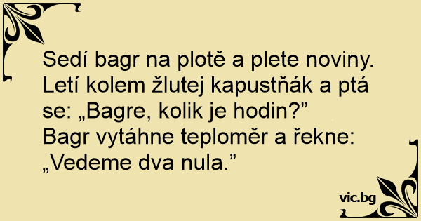 Sedí bagr na plotě a plete noviny. Letí kolem žlutej kapustňák a ptá se: „Bagre, kolik je hodin?”