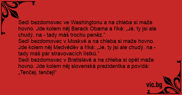 Sedí bezdomovec v Bratislavě a na chleba si opět maže hovno. Jde kolem něj slovenská prezidentka a povídá: „Tenčej, tenčej!”