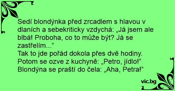 Sedí blondýnka před zrcadlem s hlavou v dlaních a sebekriticky vzdychá: „Já jsem ale blbá! Proboha, co to může být? Já se zastřelím...”