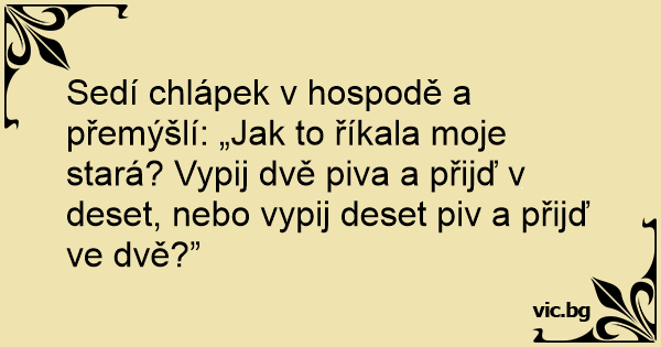 Sedí chlápek v hospodě a přemýšlí: „Jak to říkala moje stará? Vypij dvě piva a přijď v deset, nebo vypij deset piv a přijď ve dvě?”