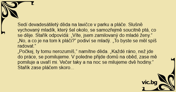 Sedí devadesátiletý děda na lavičce v parku a pláče. Slušně vychovaný mladík, který šel okolo, se samozřejmě soucitně ptá, co se děje. Stařík odpovídá: „Víte, jsem zamilovaný do mladé ženy.”