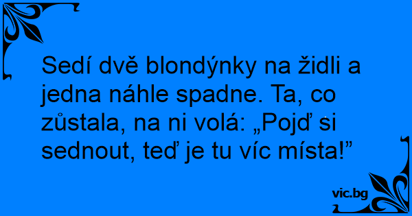 Sedí dvě blondýnky na židli a jedna náhle spadne. Ta, co zůstala, na ni volá: „Pojď si sednout, teď je tu víc místa!”