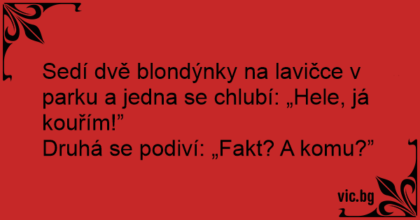 Sedí dvě blondýnky na lavičce v parku a jedna se chlubí: „Hele, já kouřím!”