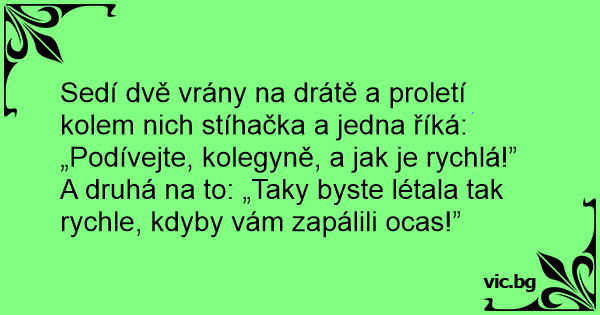 Sedí dvě vrány na drátě a proletí kolem nich stíhačka a jedna říká: „Podívejte, kolegyně, a jak je rychlá!”