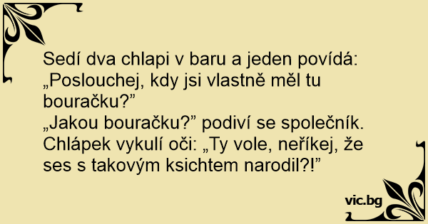 Sedí dva chlapi v baru a jeden povídá: „Poslouchej, kdy jsi vlastně měl tu bouračku?”
