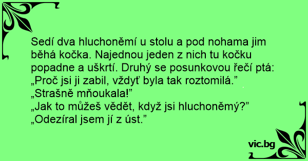 Sedí dva hluchoněmí u stolu a pod nohama jim běhá kočka. Najednou jeden z nich tu kočku popadne a uškrtí. Druhý se posunkovou řečí ptá: „Proč jsi ji zabil, vždyť byla tak roztomilá.”
