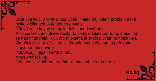 A co čert nechtěl, dívka vlezla do vody, udělala pár temp a hladina se nаd ní zavřela. Kluk pro ni okamžitě skočí a vytáhne holku ven. Zkouší ji všelijak oživit a nic. Zkouší úmělé dýchání a pořád nic. Najednou ale povídá: